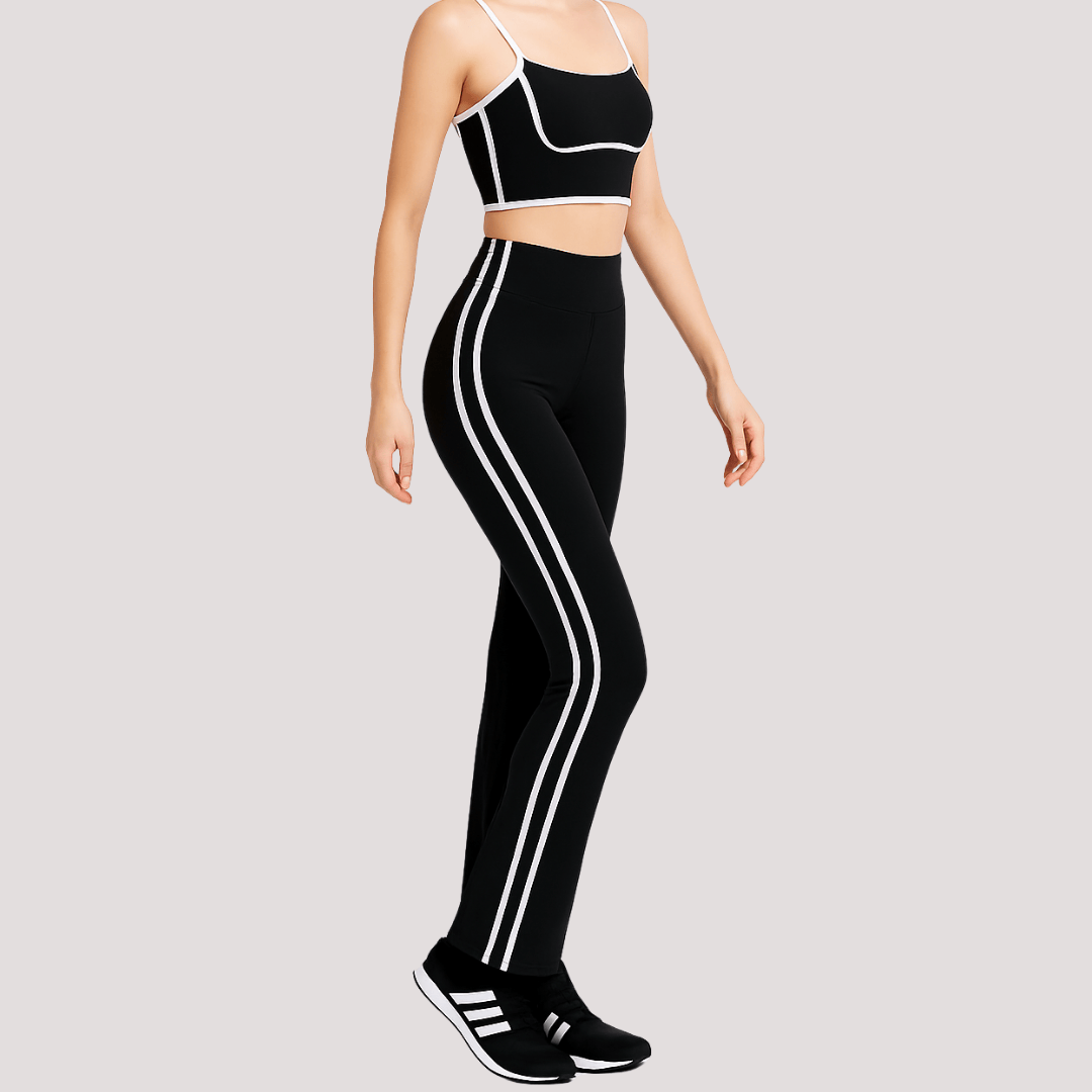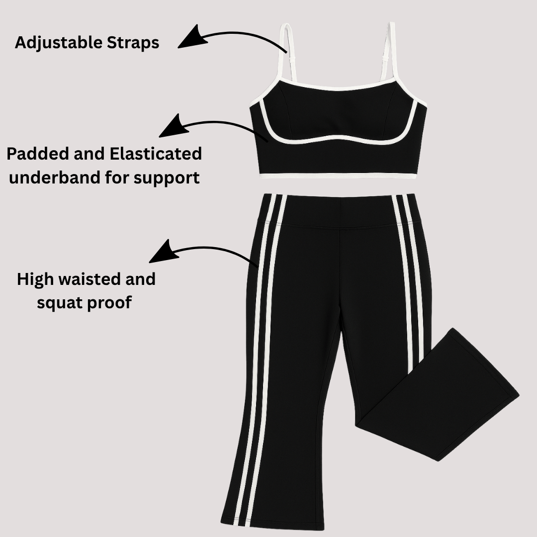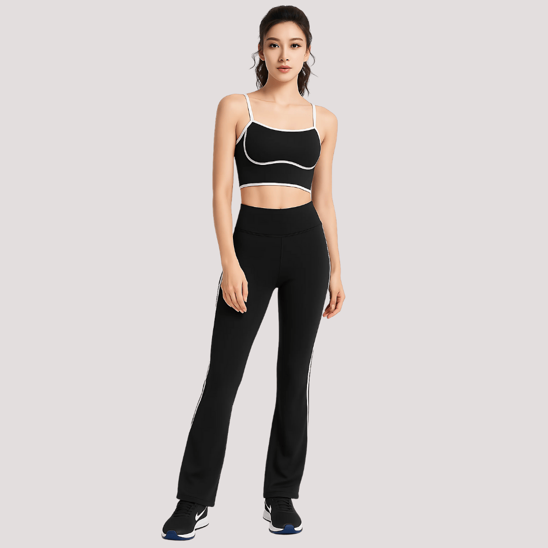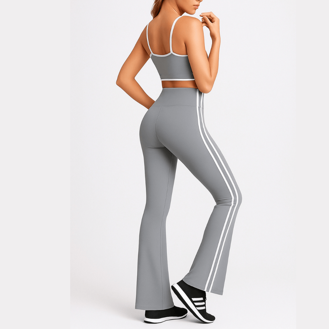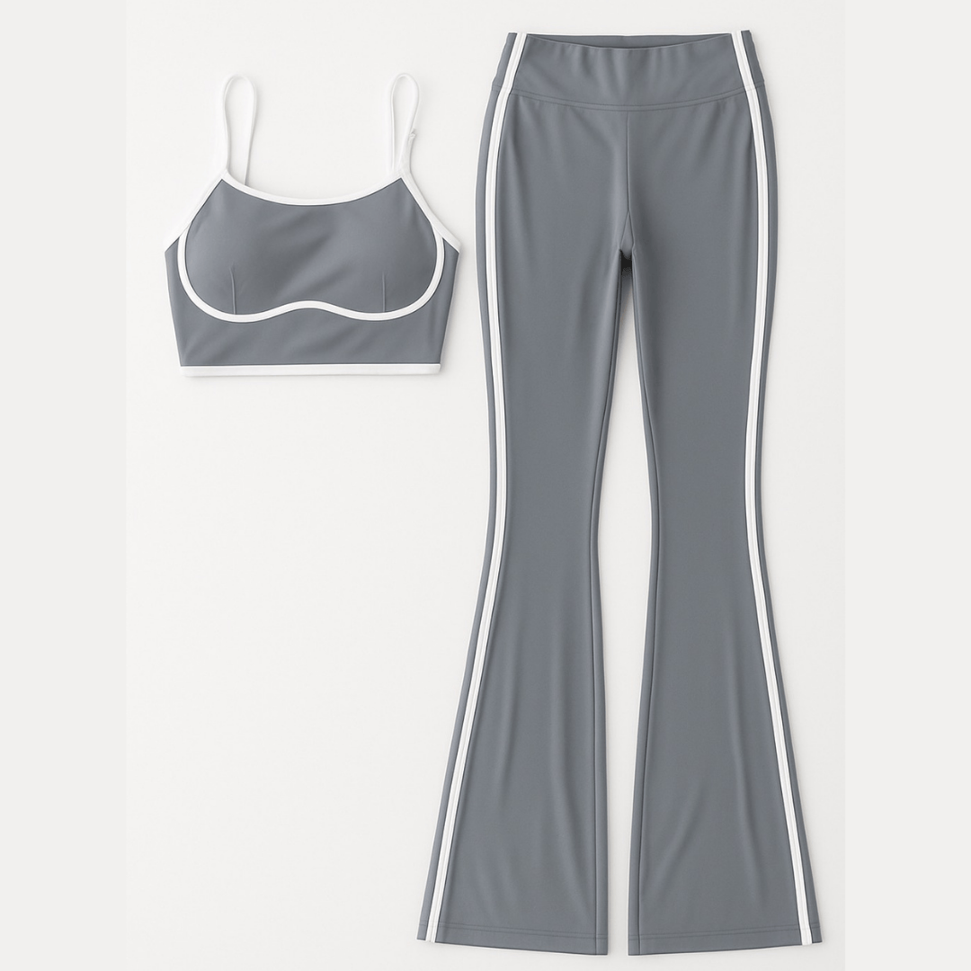 The FlareMode Contour Two-Piece Set is the ultimate blend of retro edge and modern sculpt. Designed for women who move with style, this two-piece includes a padded crop top with adjustable straps and bold contrast piping to define your shape. Paired with high-waisted flared pants featuring sporty side stripes, this set serves gym-to-street realness. Available in sleek grey and classic black, it’s breathable, body-hugging, and effortlessly cool—whether you’re strutting through the city or stretching at sunset.